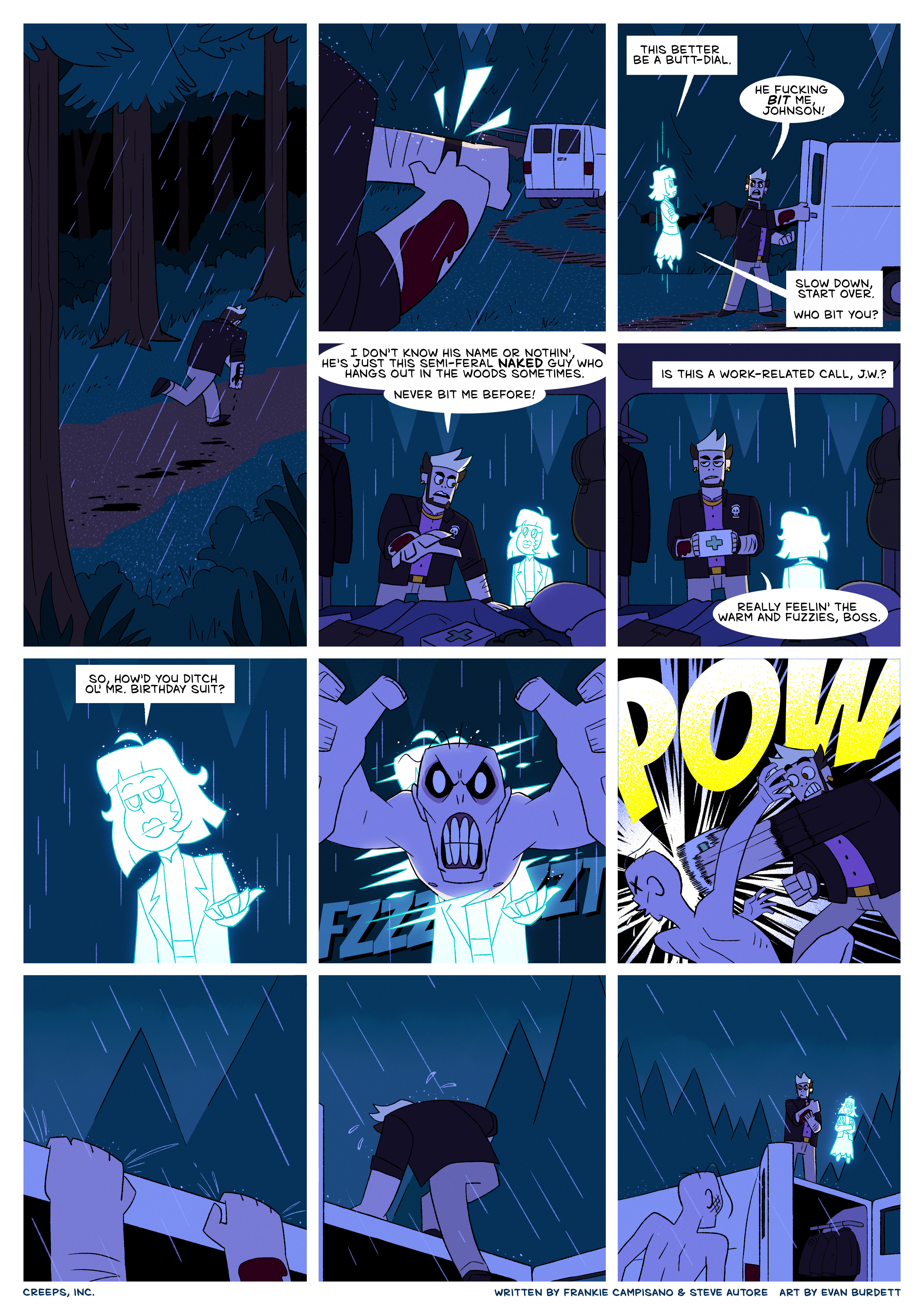 The first two pages of CREEPS, INC. featuring art by Evan Burdett.